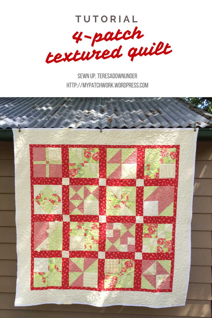 acolchado easy sewing project fabric manipulation fabric scraps project free pattern free-motion patchwork quilting textured 4-patch quilt tutorial