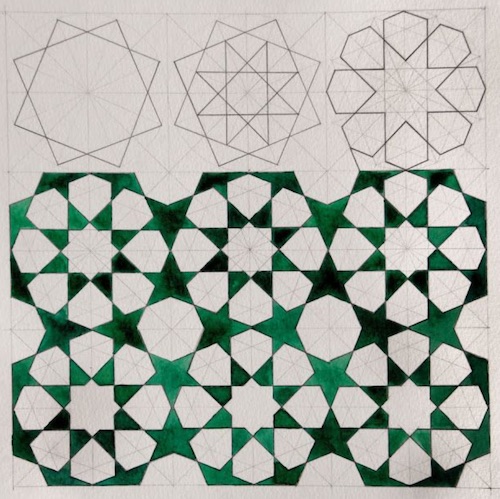 Today I learned that I probably should have called my “Morocco series” my “zellij” series. Zellij is a “style of mosaic tilework made from individually hand-chiseled tile pieces set into a plaster base”  according to Wikipedia. You can find zellij as a decorative element in many places in Morocco.  Often they’re found in historic buildings but also on fountains and on lower walls outside buildings and houses. Today’s zellij is an 8-pointed star also called ring. This ring shape can be presented in a repeated pattern or at the centre of a larger piece. I’ve called this block Marrakech Magic Star. Let’s learn how to make this block.