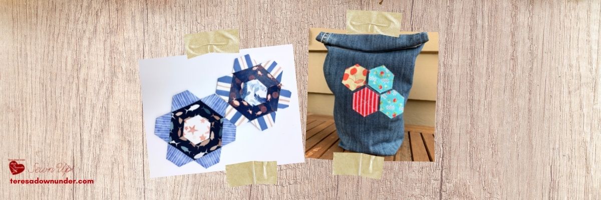 The lunch bag project is an upcycled project that uses the leg of a pair of jeans and a few hexies top stitched to the denim fabric.