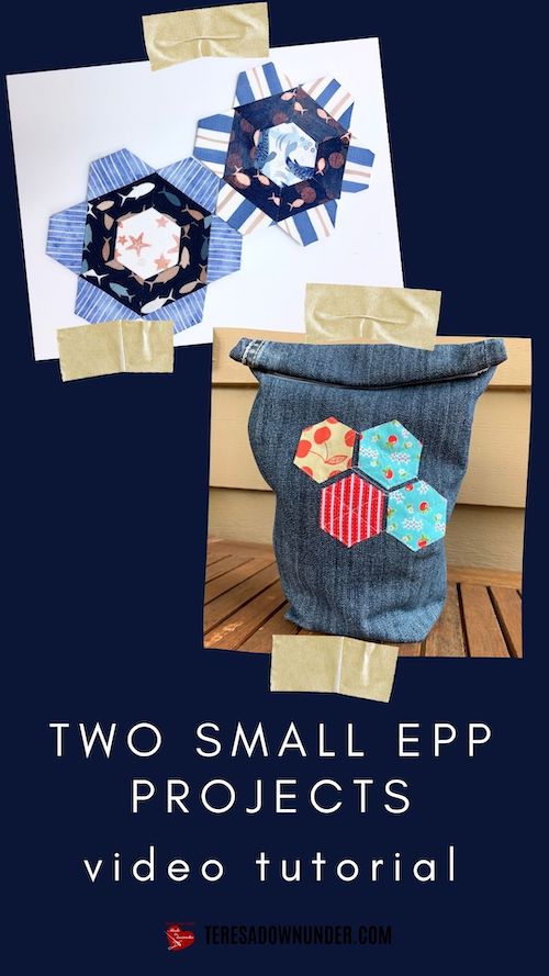 I’ve been hole punching my hexie templates for easier removal for years… it never occurred to me that I could use that hole to pin the template in place. These are two patterns I know I will use, but I think the lunch bag will be a bucket bag for me. Love it!