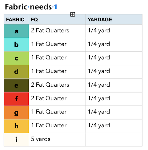 The fabric needs for each individual colour apply to a coordinated quilt like the one on the right. I made my version scrappy, so if you do as me you’ll need only a few scraps for each block. The fabric needs for the background fabric remains the same for both.