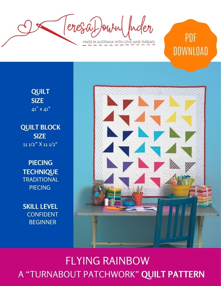 Flying rainbow features in the cover of my book Turnabout patchwork.