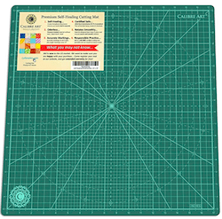 Calibre Art rotating cutting mat, 18″ x 18″. This mat is great when you need to cut fabric pieces in different directions, for instance when doing disappearing blocks.